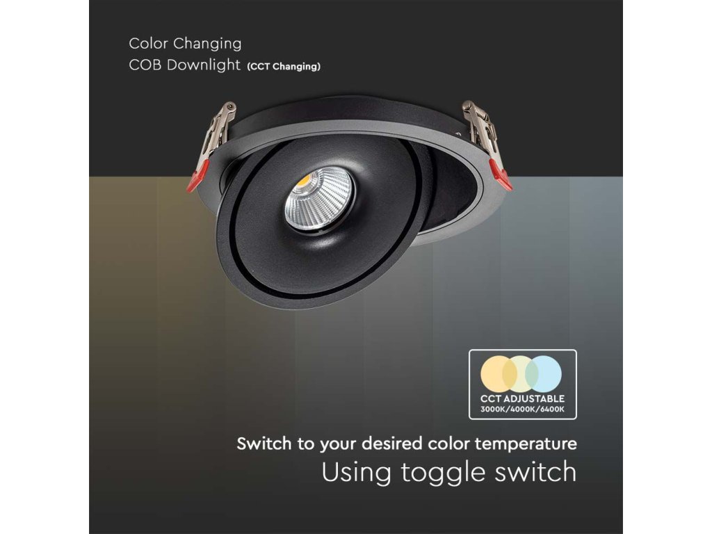 Vestavný downlight osazený vysoce účinnými COB LED čipy s možností volby 3 barevných teplot v jednom svítidle. Díky naklápěcímu mechanismu lze snadno upravit směr vyzařovaného světla. Svítidlo je vybaveno rychlospojkou pro pohodlnou instalaci a používá kvalitní napájecí zdroj. Díky nízké údržbě a dlouhé životnosti je ideální volbou pro obytné prostory, showroomy, hotely či butiky.