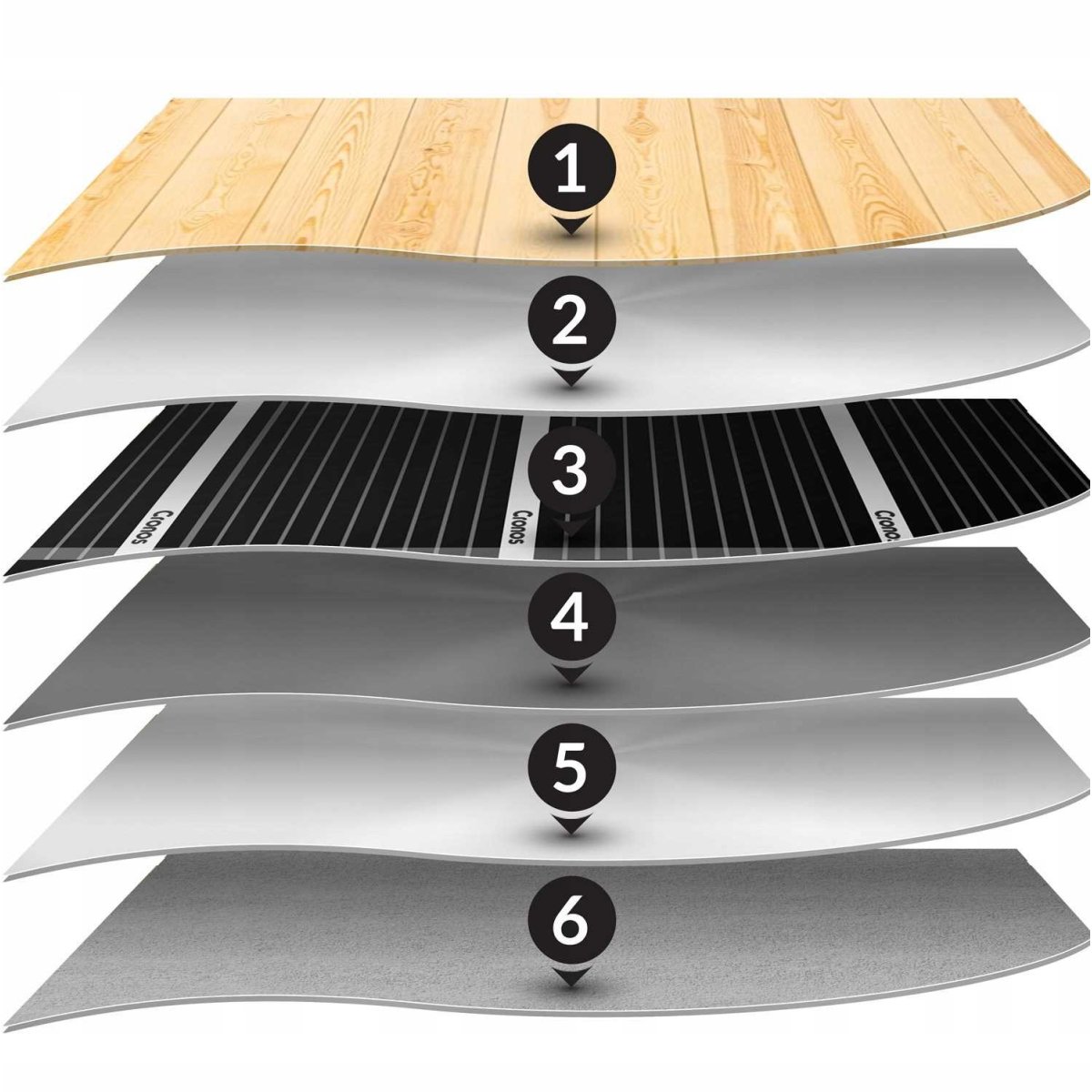 Tenký infrazářič v podobě topné fólie lze umístit přímo pod dřevěné a laminované panely. Povrch fólie musí být pokryt pouze parotěsnou fólií. Způsob pokládky panelů se nemění a teplo se přenáší přímo do místnosti. Teplota je řízena pomocí termostatu.