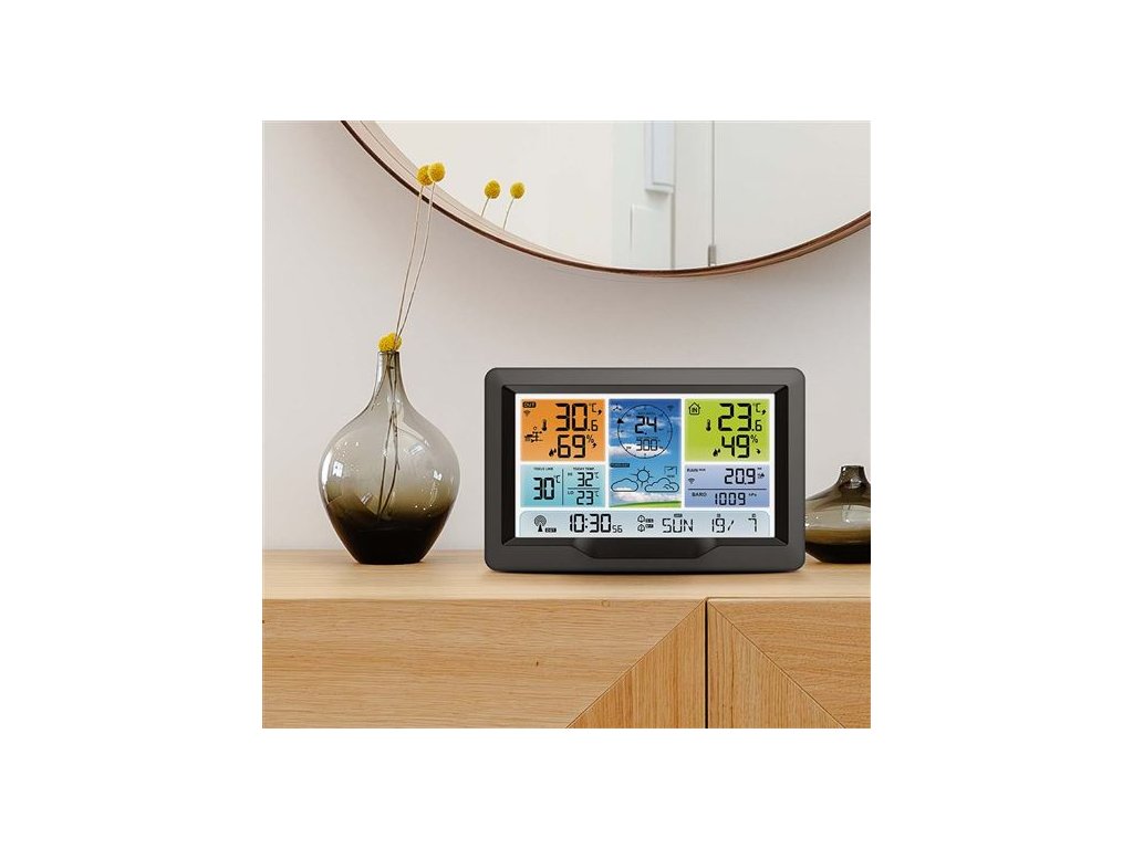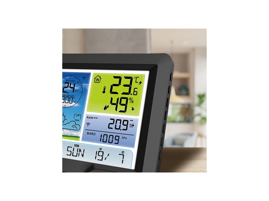 Tato profesionální meteostanice je ideálním řešením pro všechny, kteří chtějí mít kompletní přehled o počasí a atmosférických podmínkách. Vyniká velkým, dokonale čitelným 19cm displejem s možností nastavení podsvícení a zobrazuje široké spektrum meteorologických údajů včetně teploty, vlhkosti, atmosférického tlaku, směru a rychlosti větru či srážek. Díky pokročilým senzorům dokáže přesně měřit rosný bod, pocitovou teplotu, tepelný index a chlad větru, což ocení nejen meteorologičtí nadšenci, ale i zemědělci, stavitelé nebo sportovci. Rádiově řízený čas (RCC), dvojitý budík s možností odložení a předpověď počasí v 10 grafických úrovních přidávají na praktičnosti. Součástí je nastavitelná konzole s dosahem 100 m, která zajistí přesné venkovní měření, a možnost připojení až 3 přídavných senzorů umožňuje sledování podmínek na více místech současně. Paměť minimálních a maximálních hodnot, výstrahy na teplotu, vítr či srážky a notifikace o slabé baterii jsou samozřejmostí. Díky USB napájení i možnosti provozu na AA baterie je meteostanice flexibilní a snadno umístitelná, ať už ji chcete mít na stole, nebo zavěšenou na zdi. Kombinace precizního měření, širokých funkcí a kvalitního zpracování z ní dělá ideální volbu pro každého, kdo chce mít spolehlivá data o počasí na profesionální úrovni.