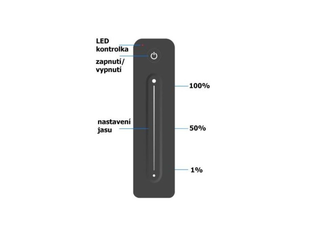 Stmívání v rozmezí 0-100%, 256 úrovní stmívání, stmívání měkké, bez blikání. Při zapnutí dojde k pozvolnému rozsvícení, při vypnutí dojde k pozvolnému setmění.