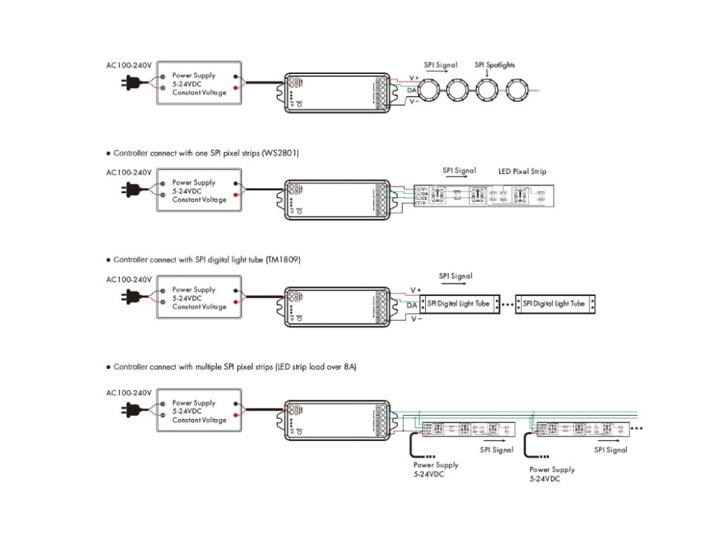 Pomocí přijímače a aplikace můžete nastavovat mnoho možností u digitálních SPI LED pásků. V možnostech je uloženo až 44 dynamických efektů, ale lze si vytvářet i vlastní scénáře i efekty. Vlastní scénáře mohou vybírat z 16 typů možností efektů (ztmavování, skákání, dýchání, blikání, proudění, duha, padající hvězda, hromadění, plavání dolů, honící se světlo, plování, blikání, odrážení, raketový let, chaotické blikání, otevírání a zavírání), 1-8 barev, plné nebo segmentové ovládání, směr pohybu vpřed nebo vzad, nastavitelný jas a rychlost a další. Přijímač lze propojit i s vaší hudbou.