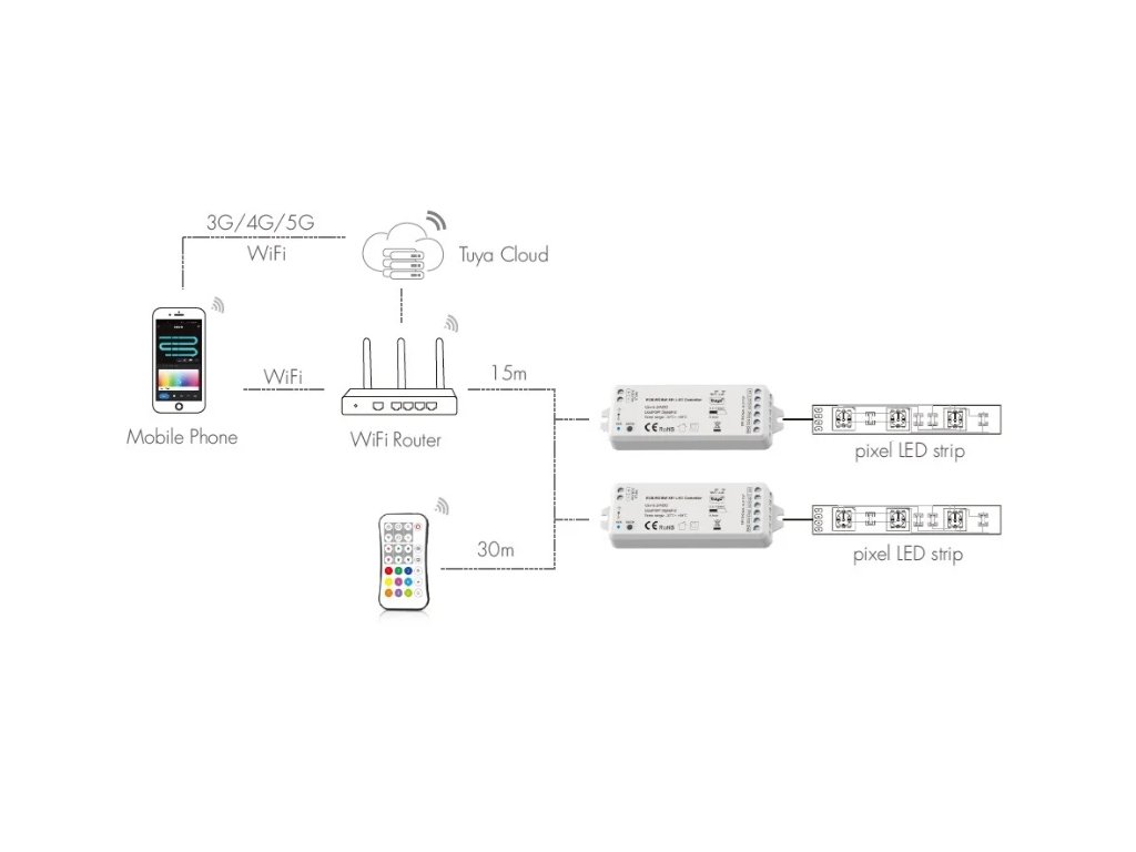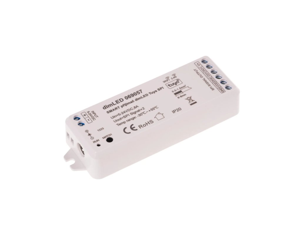 Digitální ovladačů umožňuje ovládání až 1000 LED diod (pixelů). K přijímač dimLED Tuya SPI lze dokoupit dálkový ovladač, které je určený umožňuje v kombinaci s přijímače ještě v ruce ovládat RGB a RGBW digitální LED pásky. Přijímač funguje ale také s dalšími dimLED ovladači, které umožňují například přijímač spínat.