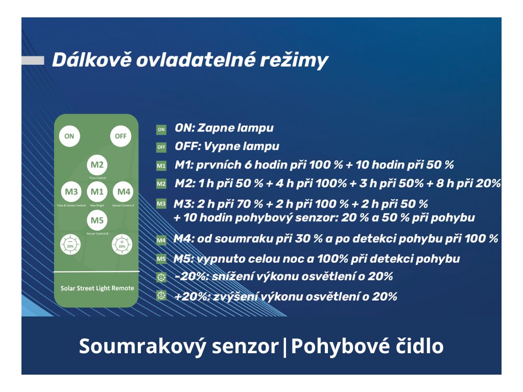LED solární svítidlo lze ovládat pomocí dálkového ovládání s následujícími režimy: