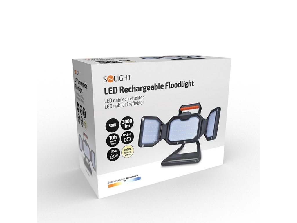 Silný, praktický a všestranný – přesně takový je přenosný LED reflektor s výkonem až 30W a světelným tokem 3000 lumenů při plném nabití. Nabízí neutrální bílé světlo (4000K), které je ideální pro práci v interiéru i venku. Tři úrovně svícení (100 %, 50 %, 20 %) umožňují přizpůsobit intenzitu světla konkrétní situaci.
