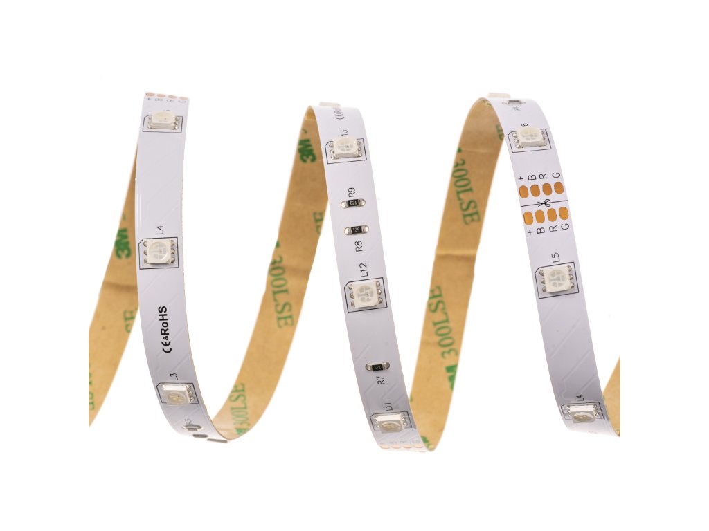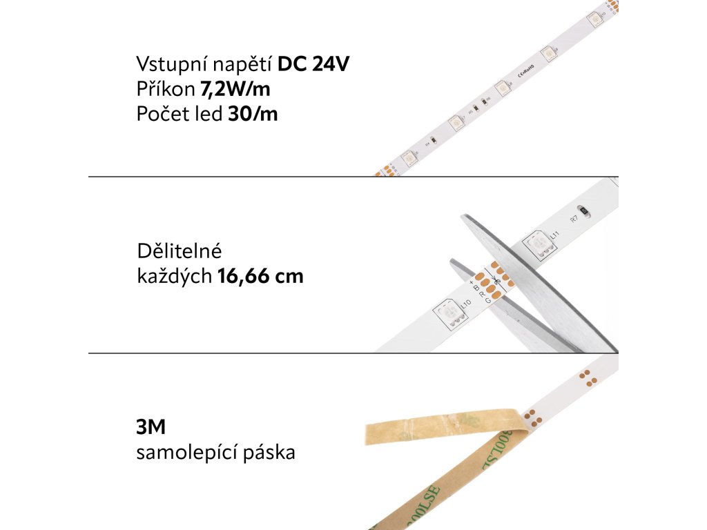 LED pásek prodáváme pouze na celé metry. Specifikace LED pásku Barevná varianta RGB Vstupní napětí 24VDC Příkon 7,2W/m Počet LED 30/m Úhel svitu 120° LED čip 5050 SMD Světelný tok celkem 439lm/m Provozní teplota -15°C až max. 60°C Životnost až 50 000h Šířka pásku 10mm Výška pásku 2,4mm Maximální délka zapojení 5-10m Návin na kotouči 5m Krytí IP20 3M samolepící páska Ano Dělitelnost Každých 16,66cm Stmívatelné Ano Záruka 3 roky K LED pásku si vyberte také zdroje, profily a ovladač. Co znamená RGB a jak funguje? To se dozvíte zde.Doplňkové parametry