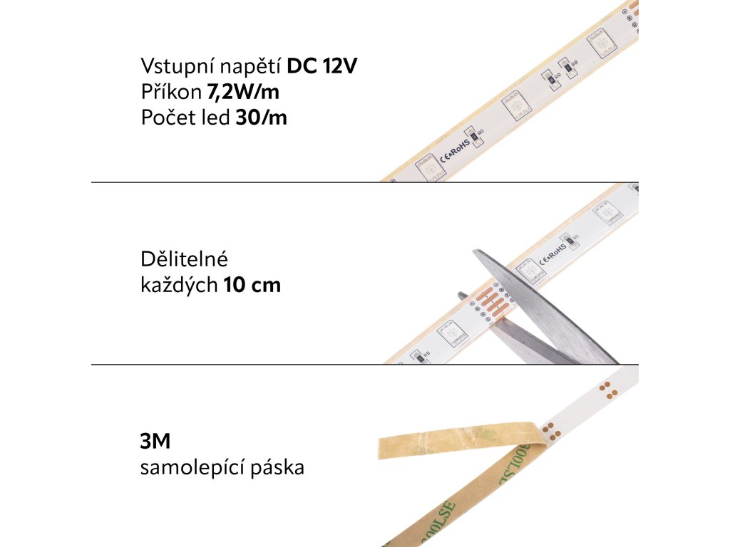 LED pásek prodáváme pouze na celé metry. Specifikace LED pásku Barevná varianta RGB Vstupní napětí 12VDC Příkon 7,2W/m Počet LED 30/m Úhel svitu 120° Světelný tok celkem 439lm/m LED čip 5050 SMD Provozní teplota -15°C až max. 60°C Životnost až 50 000h Šířka pásku 12mm Výška pásku 5mm Návin na kotouči 5m Krytí IP68 3M samolepící páska ANO Maximální délka zapojení 5m Dělitelnost každých 10cm Stmívatelné Ano Záruka 2 rokyDoplňkové parametry