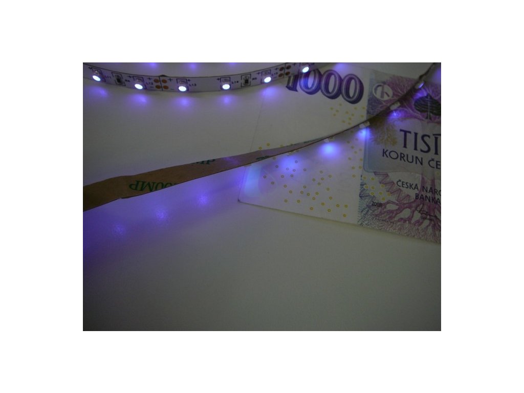 LED pásek prodáváme pouze na celé metry. Led pásky s ultrafialovým světlem se užívají pro osvětlení akvárií, terárií, diskoték či jako černé světlo. Diody u toho LED pásku jsou originální UV diody, nikoliv pouze překryty speciálním UV luminoforem jako u levnějších typů. Specifikace LED pásku Barevná varianta Ultrafialová Vlnová délka 395-405nm Vstupní napětí 12V DC Příkon 4,8W/m Počet LED 60/m Úhel svitu 120° LED čip 3528 SMD Provozní teplota -15°C až max. 60°C Životnost až 50 000h Šířka pásku 8mm Výška pásku 2,6mm Návin na kotouči 5m Krytí IP20 3M samolepící páska ANO maximální délka zapojení 10m Dělitelnost každých 5cm Stmívatelné Ano Záruka 2 roky K LED pásku si vyberte také zdroje, profily a stmívače.Doplňkové parametry