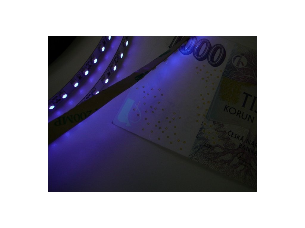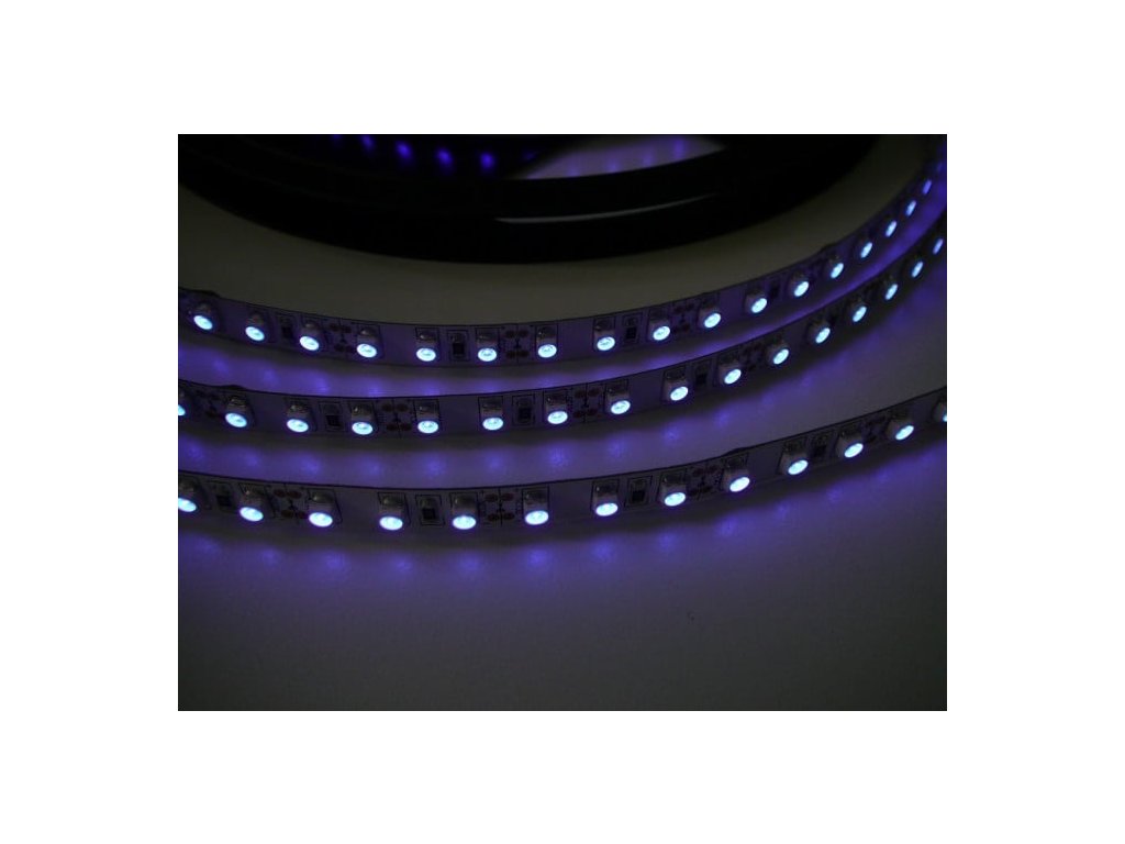 LED pásek prodáváme pouze na celé metry. Led pásky s ultrafialovým světlem se užívají pro osvětlení akvárií, terárií, diskoték či jako černé světlo. Diody u toho LED pásku jsou originální UV diody, nikoliv pouze překryty speciálním UV luminoforem jako u levnějších typů. Specifikace LED pásku Barevná varianta Ultrafialová Vlnová délka 395-405nm Vstupní napětí 12V DC Příkon 9,6W/m Počet LED 120/m Úhel svitu 120° LED čip 3528 SMD Provozní teplota -15°C až max. 60°C Životnost až 50 000h Šířka pásku 8mm Výška pásku 2,6mm Návin na kotouči 5m Krytí IP20 3M samolepící páska ANO maximální délka zapojení 10m Dělitelnost každých 2,5cm Stmívatelné Ano Záruka 2 roky K LED pásku si vyberte také zdroje, profily a stmívače.Doplňkové parametry