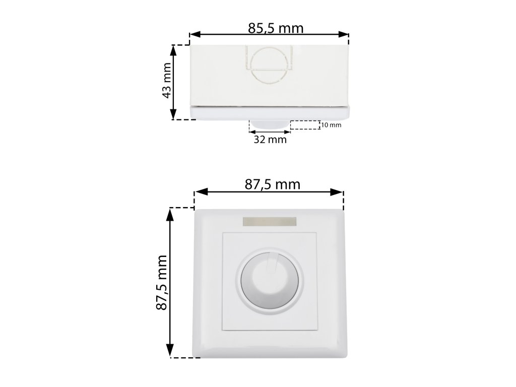 Stmívač jednokanálový manuální pro ovládání intensity jasu LED pásků, žárovek 12-24VDC a jednobarevných modulů. Specifikace LED stmívače Vstupní napětí 12-24V DC Zatížení 16A 12V 192W / 24V 384W Stmívání 0 - 100% Připojení vstup/výstup - šroubovací svorkovnice Rozměry 85×85×60mm Barva bílá Typ stmívání PWM modulace Paměť posledního nastavení po odpojení napájení: ANO Stupeň krytí: IP20Doplňkové parametry