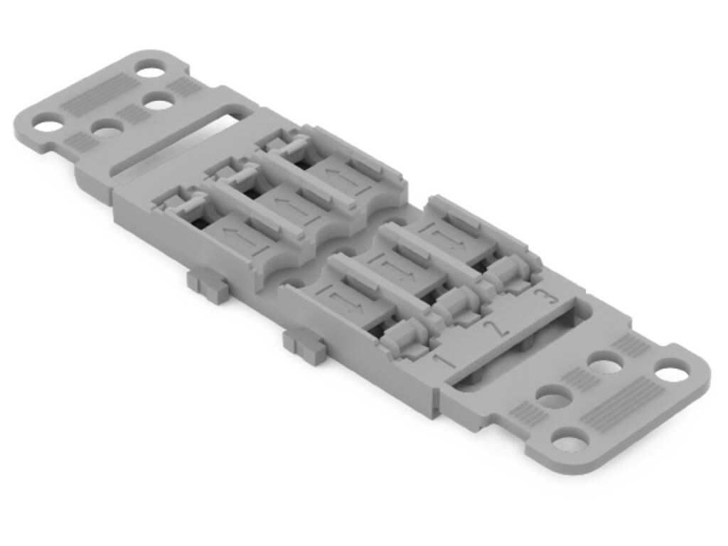 Držák svorek v trojnásobném provedení je určen pro přehledné a bezpečné upevnění spojovacích svorek pomocí šroubů. Vhodný pro použití v rozvaděčích, instalačních krabicích a elektroinstalacích, kde je potřeba pevné uchycení svorek bez DIN lišty. Konstrukce umožňuje montáž tří svorek vedle sebe, čímž zajišťuje přehlednou organizaci vodičů.
