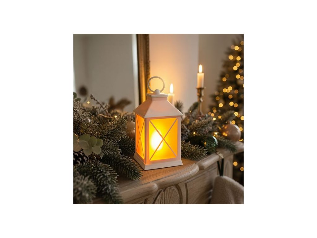 Lucerna je vyrobena z odolného plastu v elegantní bílé barvě, což jí dodává klasický vzhled a dlouhou životnost. Ideální doplněk pro zimní večery, vánoční dekorace nebo jako stylový dárek pro vaše blízké.