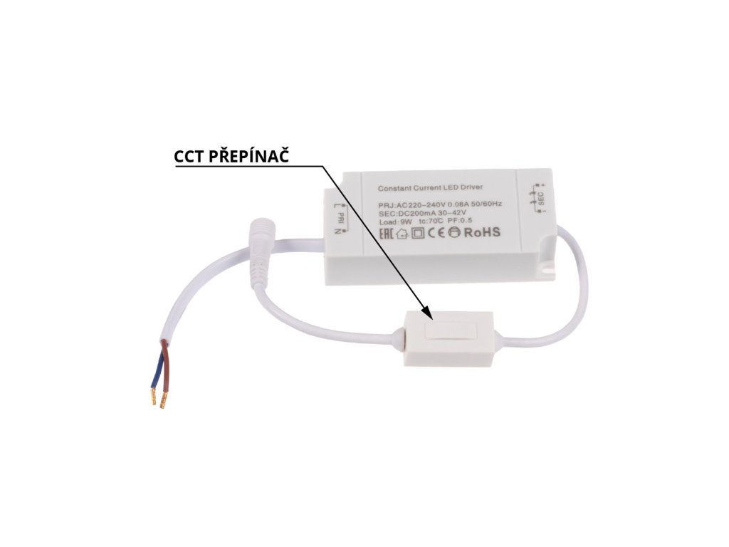 Na napájecím zdroji svítidla se nachází přepínač pro nastavení teploty světla (CCT). Podle potřeby si můžete přímo při instalaci zvolit jednu ze tří barev světla: