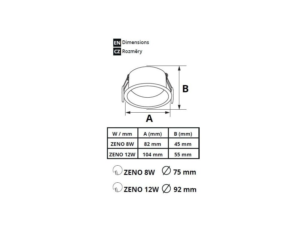 Montáž je rychlá a jednoduchá díky pružinám, které jsou součástí balení. Doporučený montážní otvor ve stropě je 75 mm. Na napájecím zdroji svítidla najdete přepínač pro nastavení teploty světla (CCT), který umožňuje zvolit jednu ze tří barev světla: