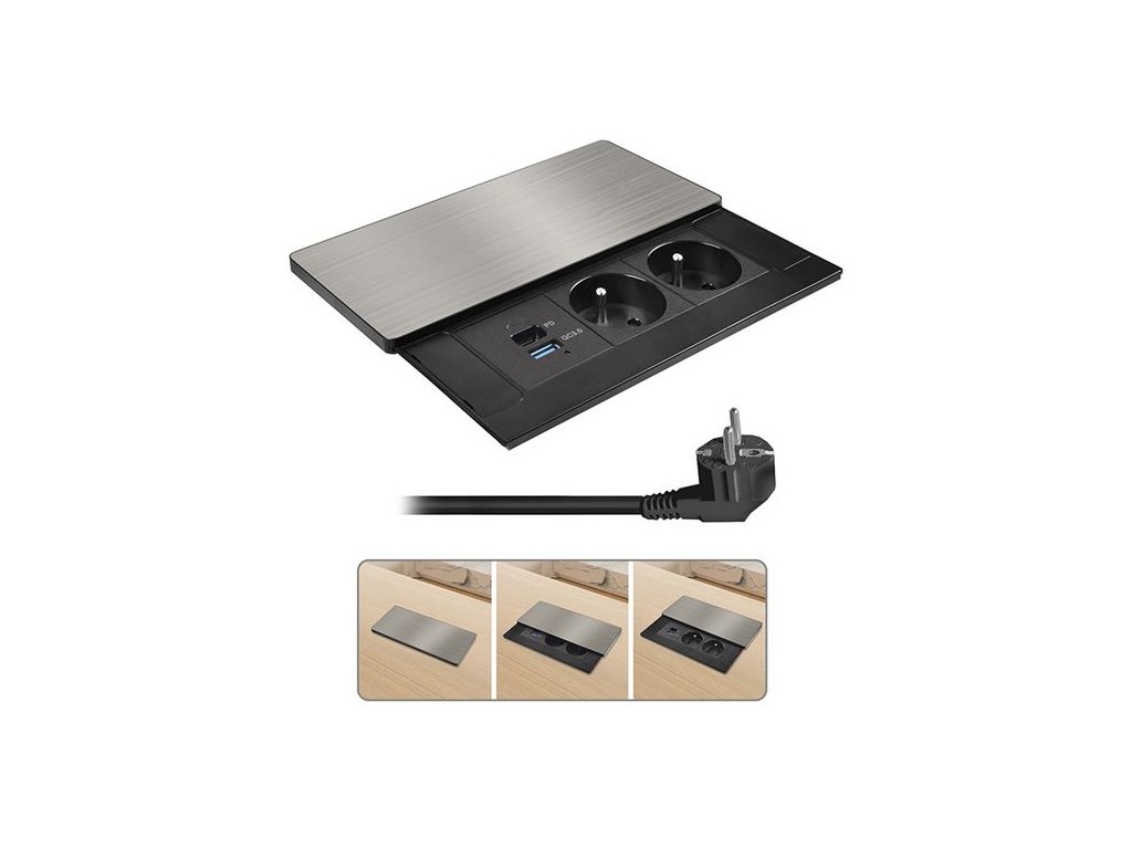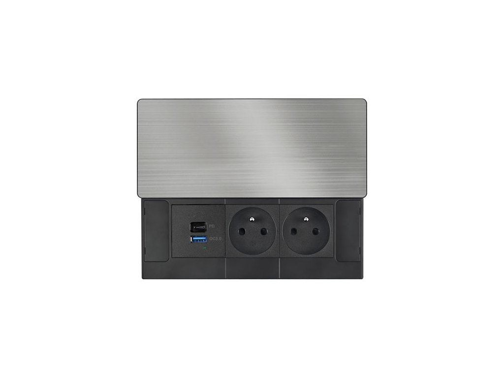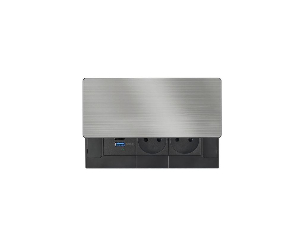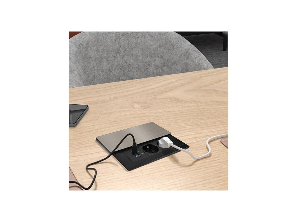 Vrchní kryt z matné tmavé nerez oceli (inox) působí elegantně a přirozeně zapadne do moderního interiéru. Nízký profil, čisté linie a nenápadné posuvné otevírání zachovávají vzhled pracovní plochy. Zásuvky i nabíjecí porty jsou kdykoli snadno přístupné jednoduchým pohybem ruky.
