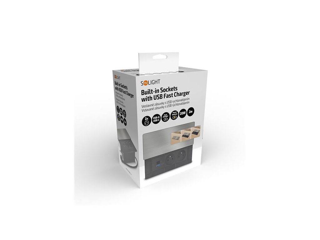 Vestavný blok zásuvek přivádí elektrickou energii i rychlé USB nabíjení přímo do pracovního stolu nebo kuchyňské linky. Dvě zásuvky 230 V s dětskými pojistkami jsou doplněny o USB-A a USB-C porty s technologií rychlého nabíjení až 20 W. Integrovaný posuvný kryt chrání vnitřek před prachem a nečistotami, napájecí kabel o délce 2 metry nabízí dostatek prostoru pro běžné umístění.