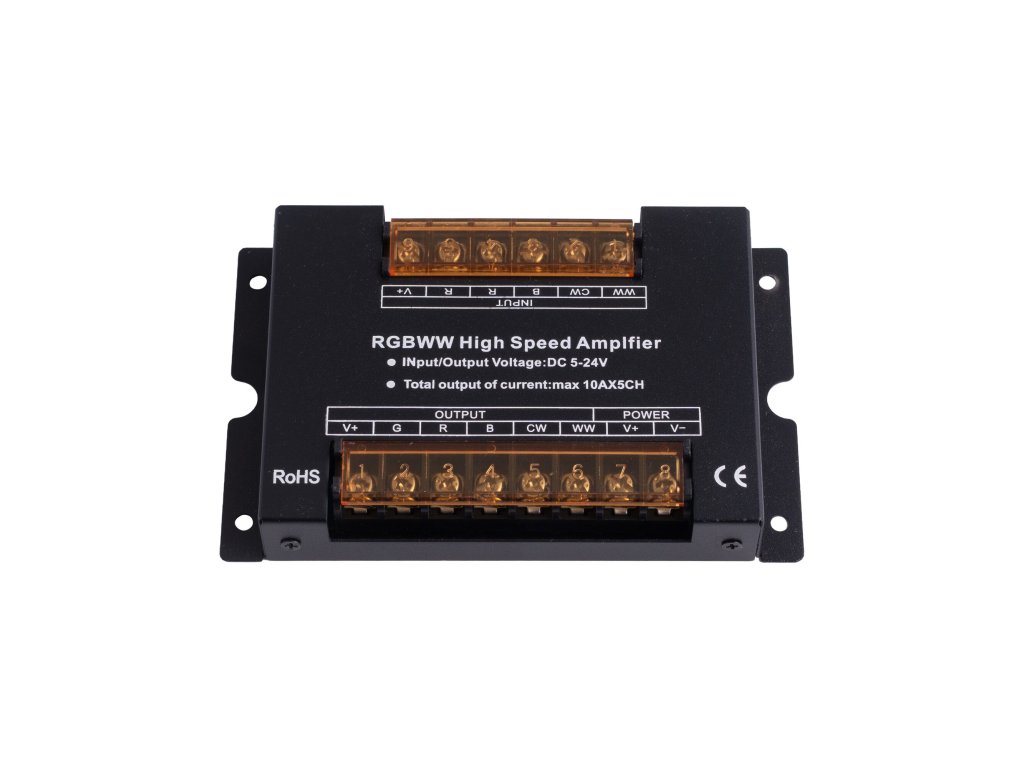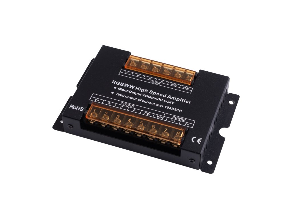 Zesilovač pětikanálový RGBCCT signálu RGBCCT LED produktů. Slouží k rozšíření výkonů LED ovladačů nad jejich přípustné zatížení. Například k ovladači s max. zatížením 72W připojením zesilovače přidáte další úsek o 600W. Pozor, hodnoty se nesčítají. Na zesilovač můžete připojit pouze doporučené zatížení. Možnost použití i pro zesílení signálu jednobarevných LED pásků. Na vstupu použijete společné +, pro společné mínus proklemujete vstupní svorkovnici, výstupy zapojte samostatně každý zvlášť, tzn. výstupy nepropojujte.